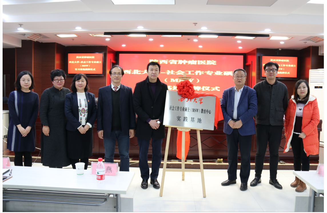 12月13日,西北大学社会工作专业硕士(MSW)教育中心与陕西省肿瘤医院共建社会工作专业教学实习基地揭牌及签约仪式在陕西省肿瘤医院举行。我校研究生院任保平院长、437必赢会员中心张学广院长、耿建副院长、研究生专业学位办公室马燕主任、社会工作专业硕士(MSW)教育中心师生,以及陕西省肿瘤医院宋张骏院长、姚俊涛副院长、护理部谢娟主任、患者服务中心孙晓茹主任等职能部门代表80余人出席并见证了这一重要活动。